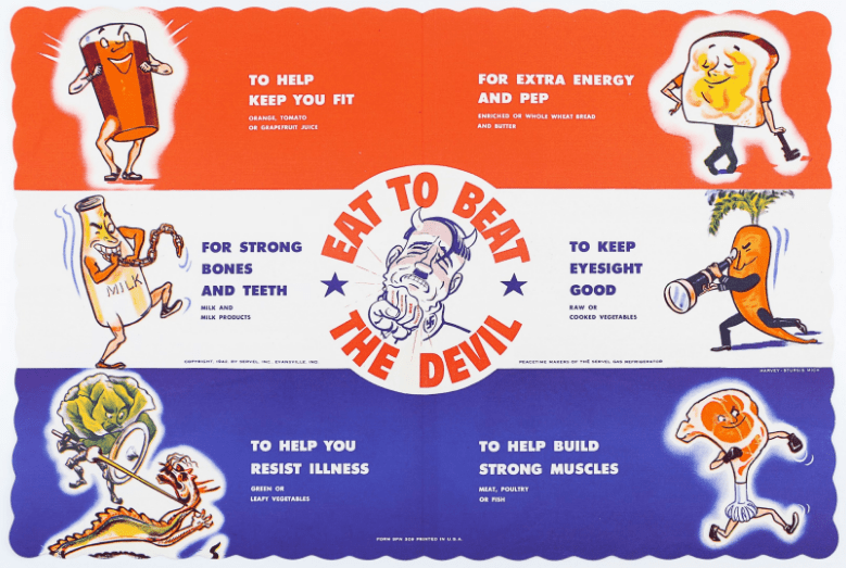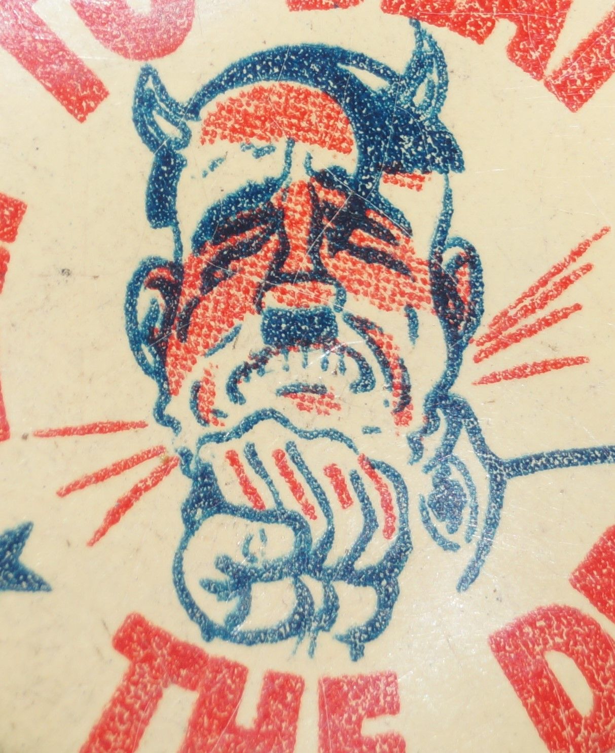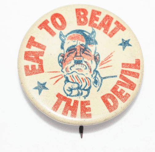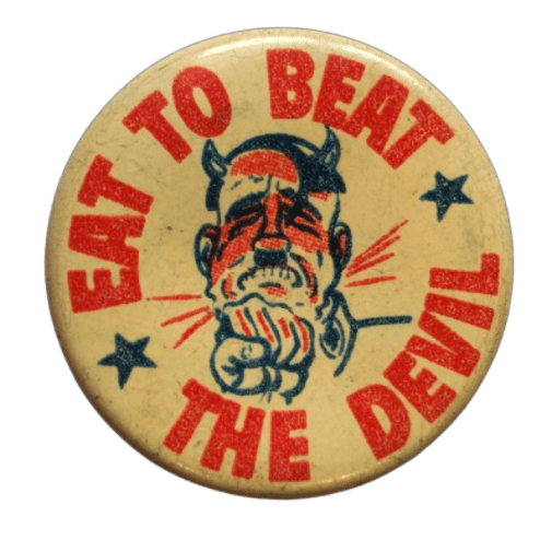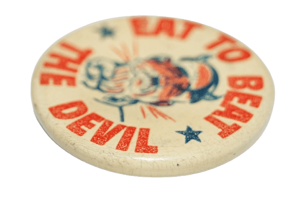 Badge "Eat to Beat the Devil" original de la seconde guerre mondiale représentant le dessin d'Hitler avec les cornes du diable, recevant un coup de poing. Le badge à épingle en métal, aux couleurs patriotiques américaines, a été réalisé dans la cadre d'une campagne nationale pour stimuler la production de guerre grâce à une meilleure nutrition (U.S. Department of Agriculture's War Food Administration).