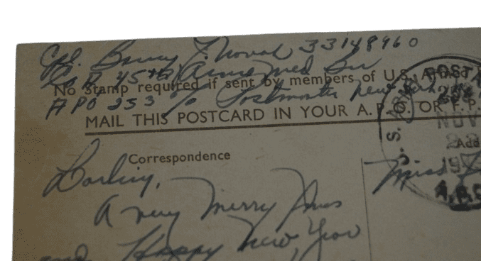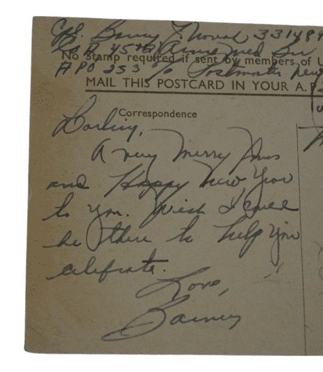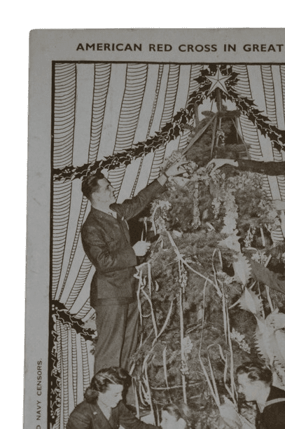 Carte postale American Red Cross in Great Britain originale de la seconde guerre mondiale envoyée en Novembre 1943 par le Corporal Barney J. Novak 45th Armored Medical Bn, Co A. La carte est adressée d'Angleterre à sa petite amie Josephine pour lui souhaiter de joyeuses fêtes.