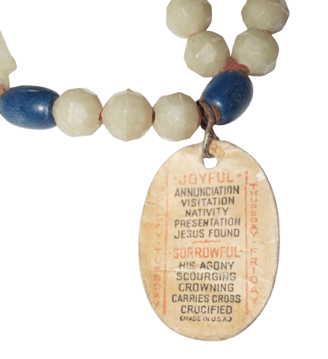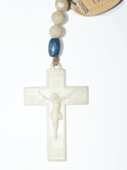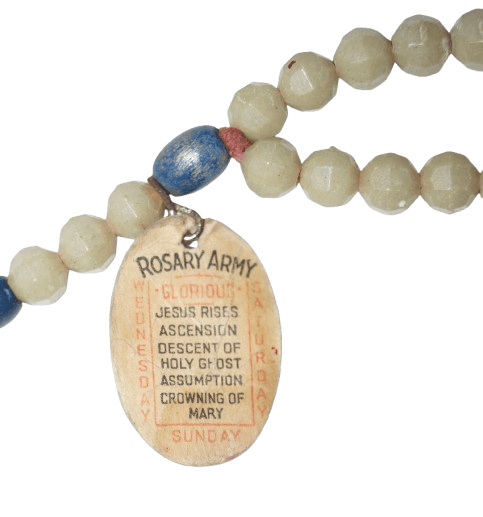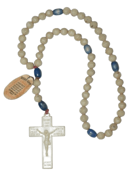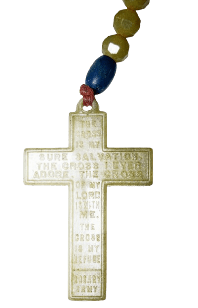 Chapelet phosphorescent Army original de la seconde guerre mondiale, conçu pour le personnel militaire de confession catholique, ce chapelet était présent dans le kit religieux en photo ci dessous. Le chapelet brille dans le noir, l'étiquette en papier est encore présente. Marquage au dos de la croix "Rosary Army". En bon état, quelques usures. Longueur : 28 cm.