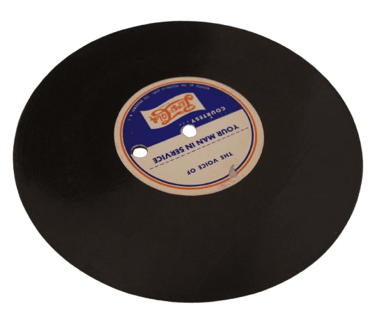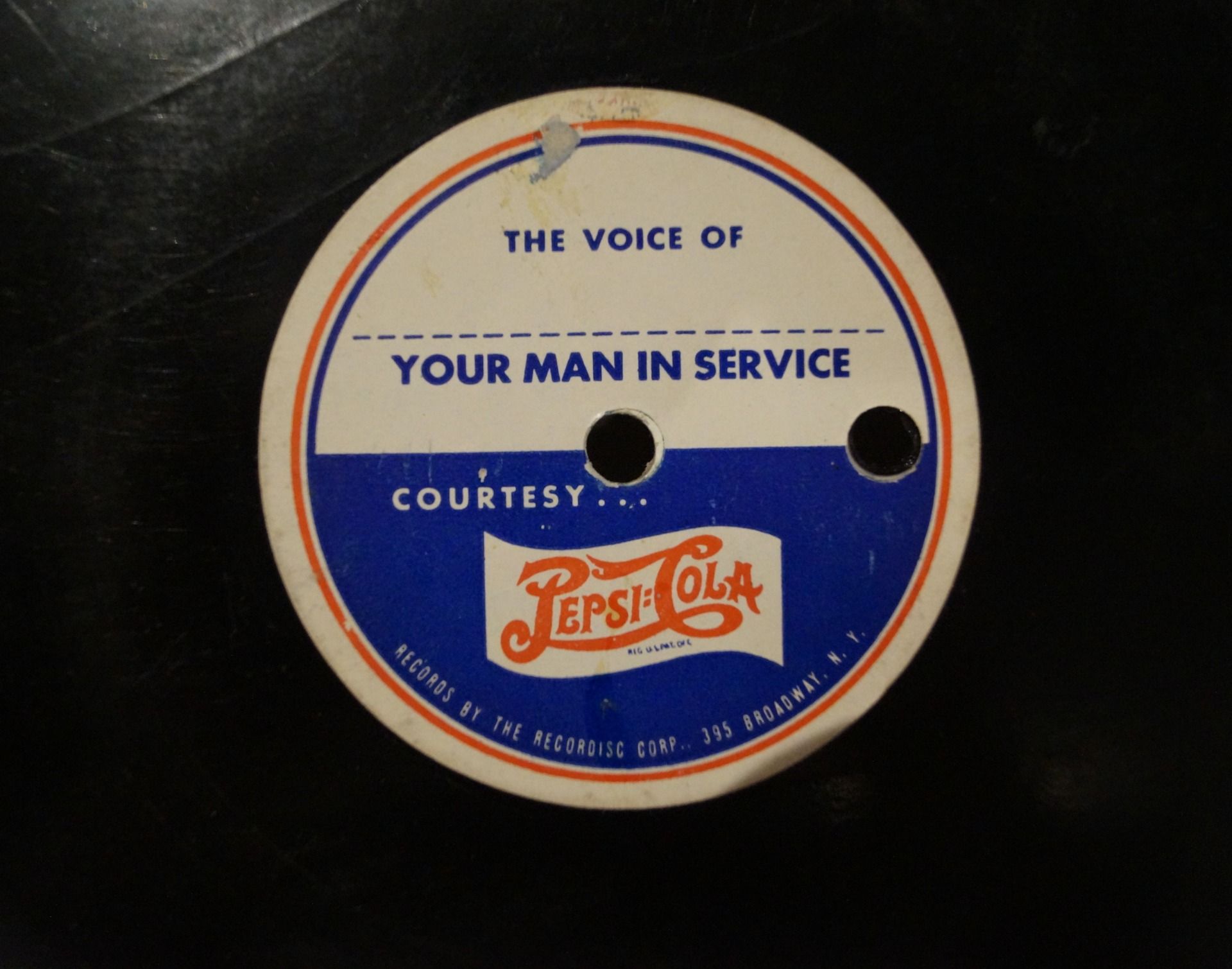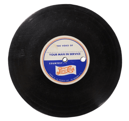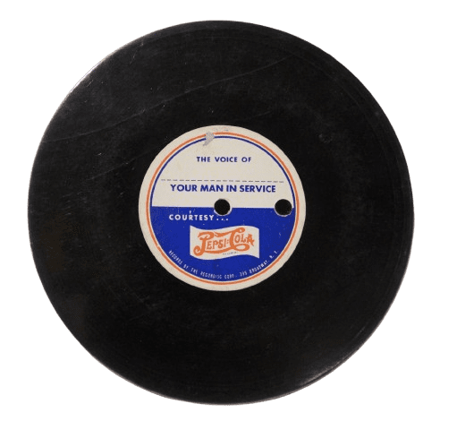 Disque Pepsi-Cola original de la seconde guerre mondiale, distribué au personnel militaire américain par la marque Pepsi-Cola et permettait d'enregistrer un message vocal grâce à un appareil spécial le "Field Transcription Player", celui ci n'a pas été enregistré. En bon état, des usures et rayures. Diamètre 16,2 cm.