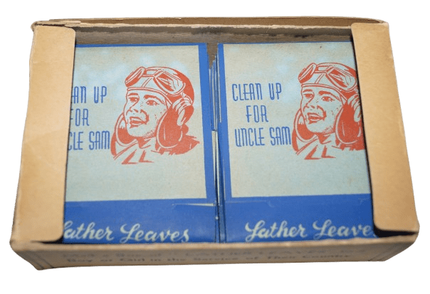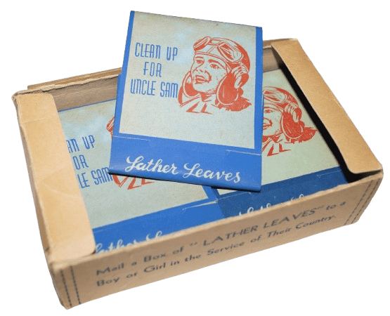 Savon en feuilles, modèle pilote original de la seconde guerre mondiale, l'étui contient des feuilles de savon à humidifier et utiliser de même manière qu'un savon en barre, pour la toilette et le rasage. La boite carton (non incluse), indique que le savon peut être expédié au personnel militaire homme et femme. En bon état, quelques usures et tâches. Dimensions de l'etui 10 x 7,7 cm.
