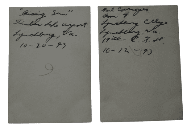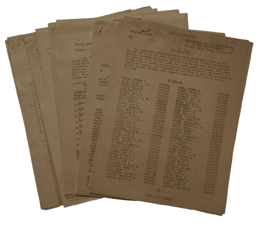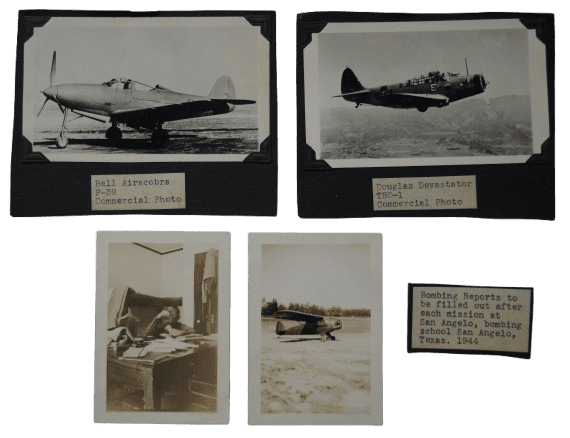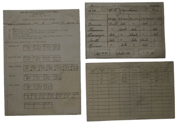 - Seize documents datés de Janvier 1945 à Décembre 1945 relatifs à sa formation dans plusieurs centre des États-Unis (Randolf Field et San Angelo Army Air Field au Texas, AAF Technical Trainig Command St Louis Missouri, Langley Field Virginie, Mountain Home Army Airfield Idaho, Walla Walla Army Air Field Washington, Army Air Base Westover Field Massachusetts)
