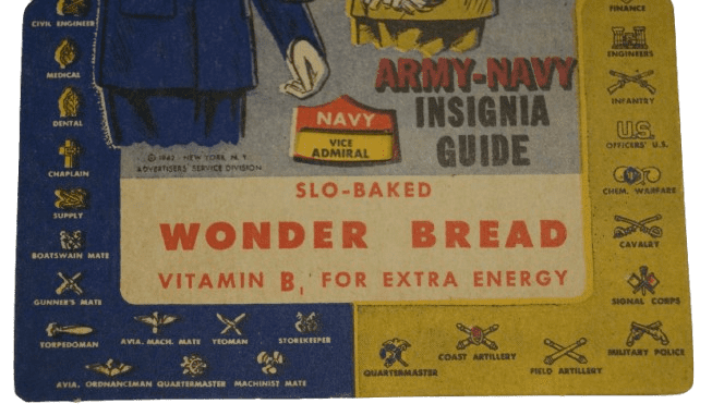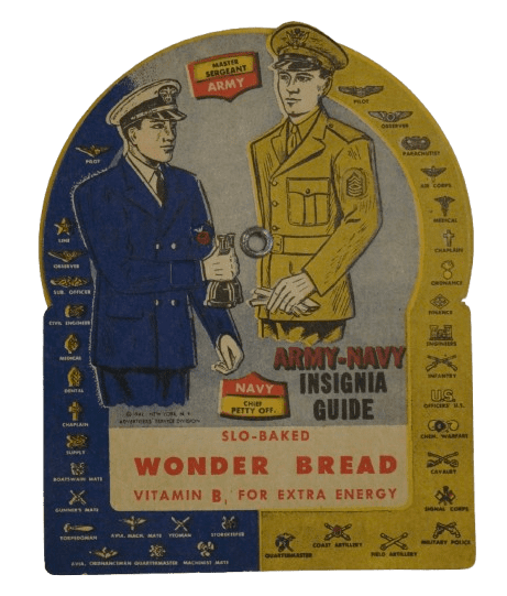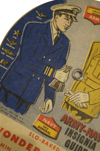 Guide de reconnaissance d'insignes original de la seconde guerre mondiale, en carton, édité par la marque de pain Wonder Bread en 1942 pour reconnaitre les grades de l'US ARMY et l'US NAVY, en faisant tourner le disque. En bon état, quelques usures et une petite pliure. Dimensions 13,5 x 10,4 cm.