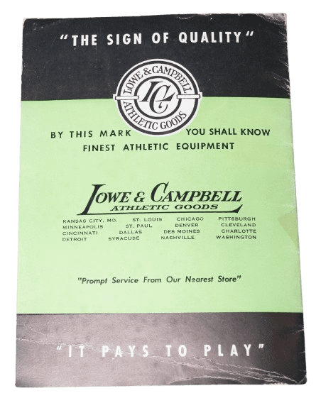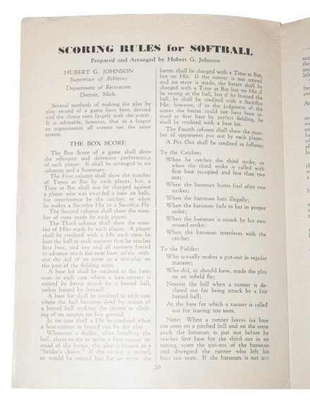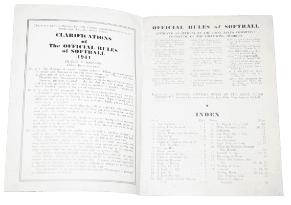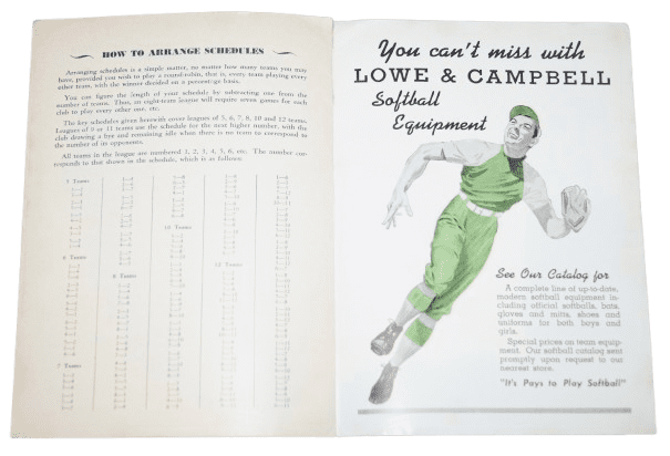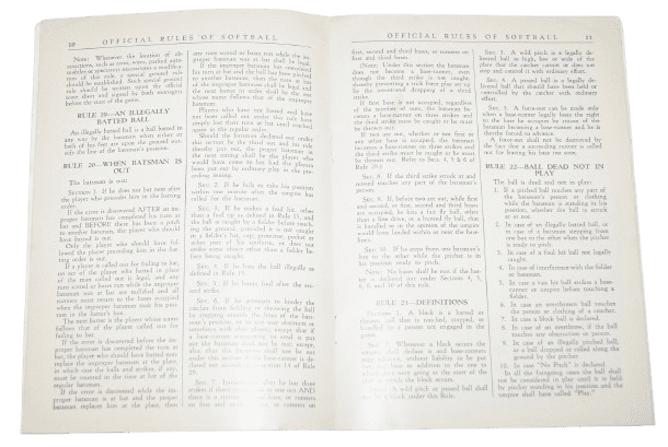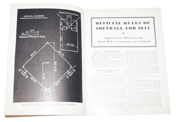Guide de softball original de la seconde guerre mondiale. Ce livret de 24 pages a été édité en 1944 par le fabriquant d'articles de sport Lowe & Campbell Athletic Goods et regroupe toutes les informations à connaitre sur les règles du softball. Le softball et le baseball étaient des sports très pratiqués par le personnel militaire masculin et féminin pendant le temps libre. En bon état, des usures et et petites déchirures sur la couverture. Dimensions : 17,8 x 12,7 cm.