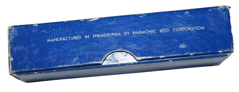 Harmonica US Army Band originale de la seconde guerre mondiale, vendue dans les PX pour divertir le personnel militaire américain. Harmonica dans sa boite d'origine, fabriquée par Harmonic Reed Corporation, Philadelphia PA. L'harmonica fonctionne parfaitement, en bon état, la boite comporte plusieurs usures. Dimensions de la boite 11,4 x 3,7 x 2,5 cm.
