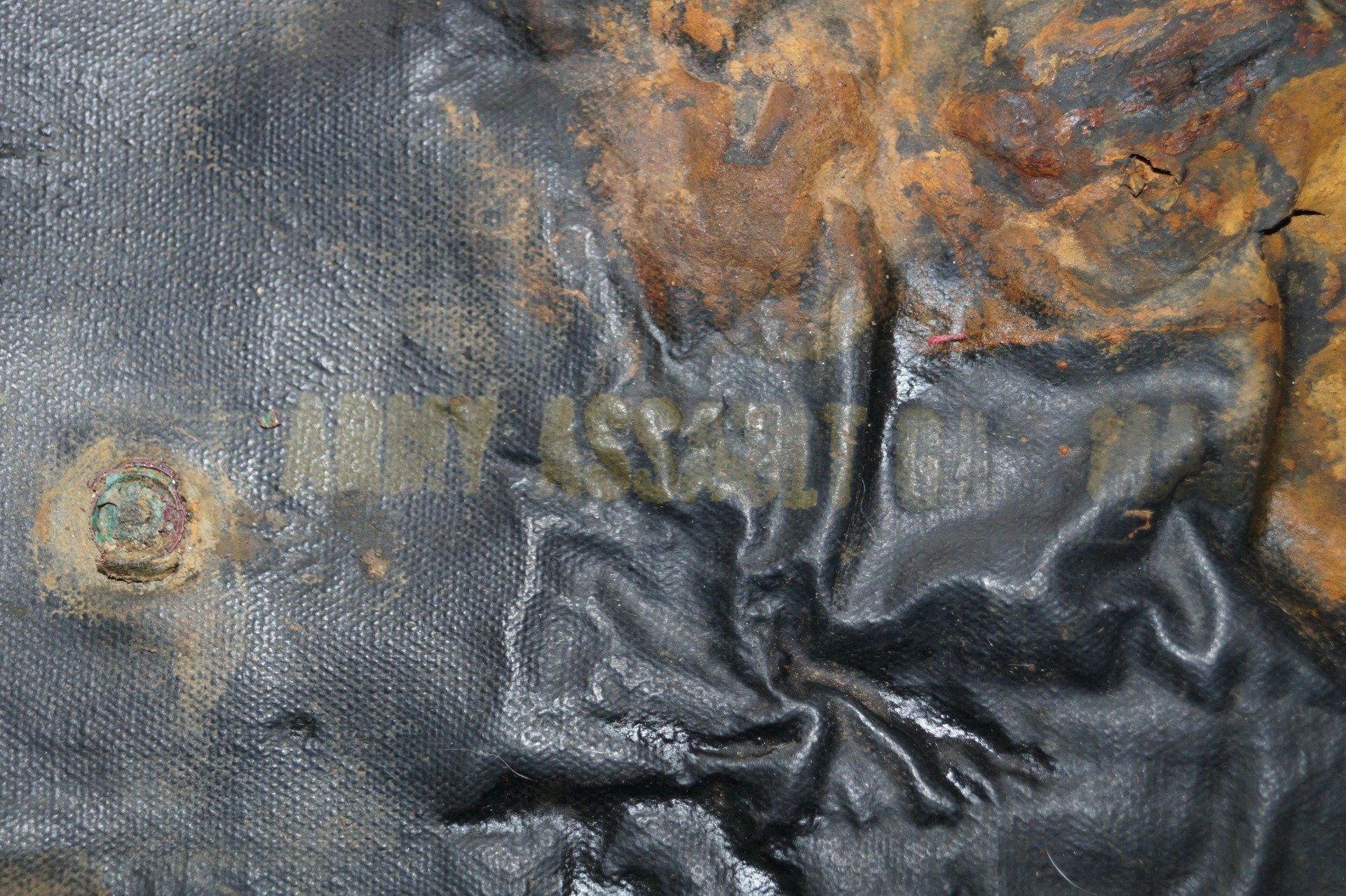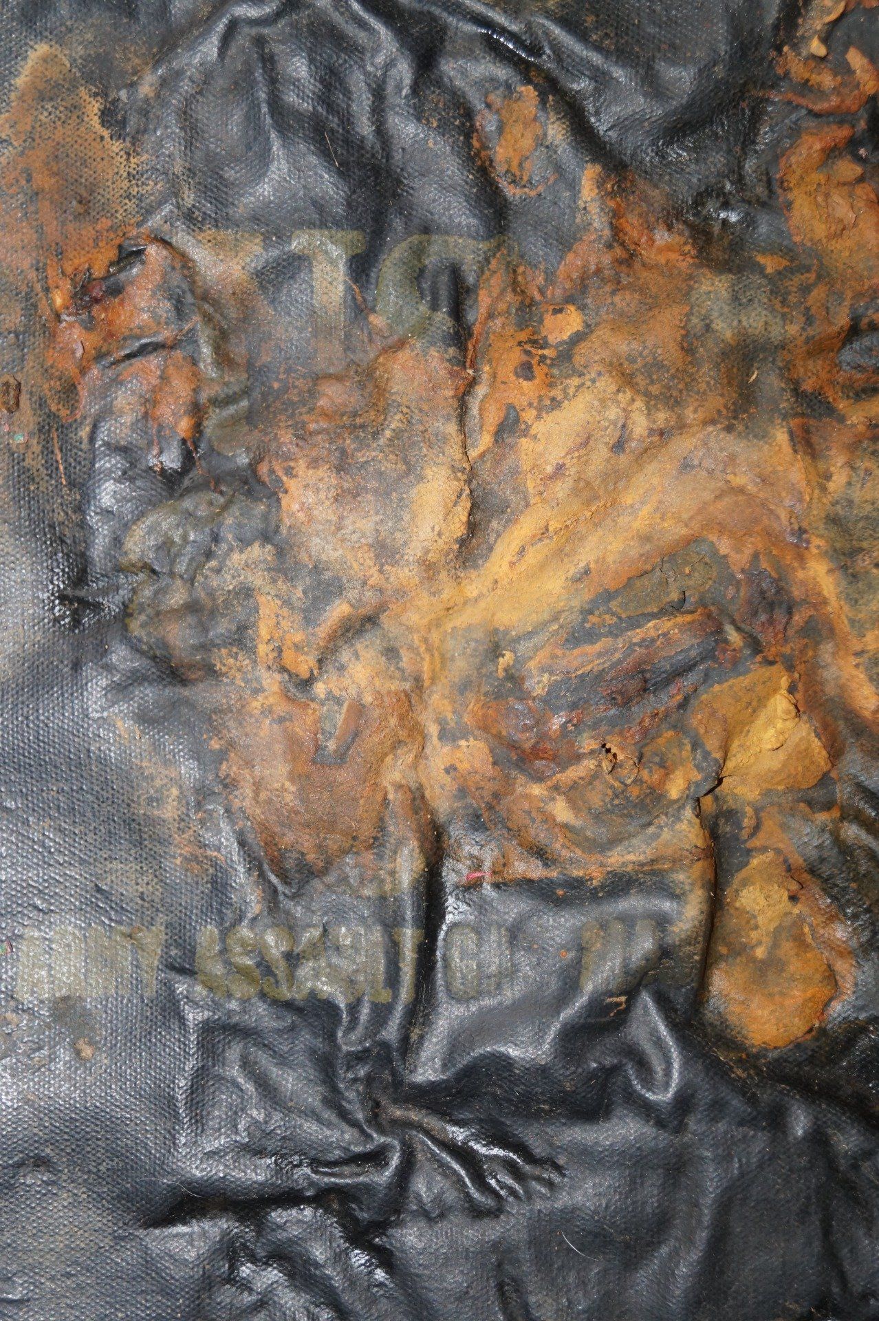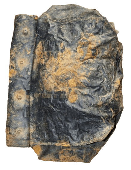 Housse M7 originale de la seconde guerre mondiale, retrouvée en Normandie secteur Omaha Beach. Ces housses étanches caoutchoutées pour le transport du masque à gaz d'assaut M5 étaient utilisées par les parachutistes et premières vagues d'assaut lors du débarquement de Normandie. Sur le devant de la housse les marquages US et ARMY ASSAULT GAS MASK sont encore visibles.