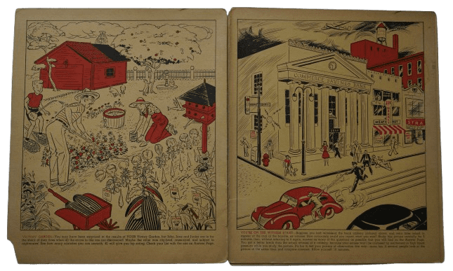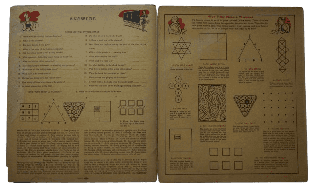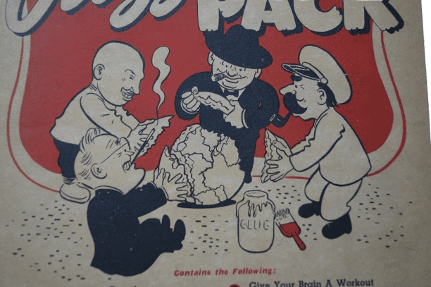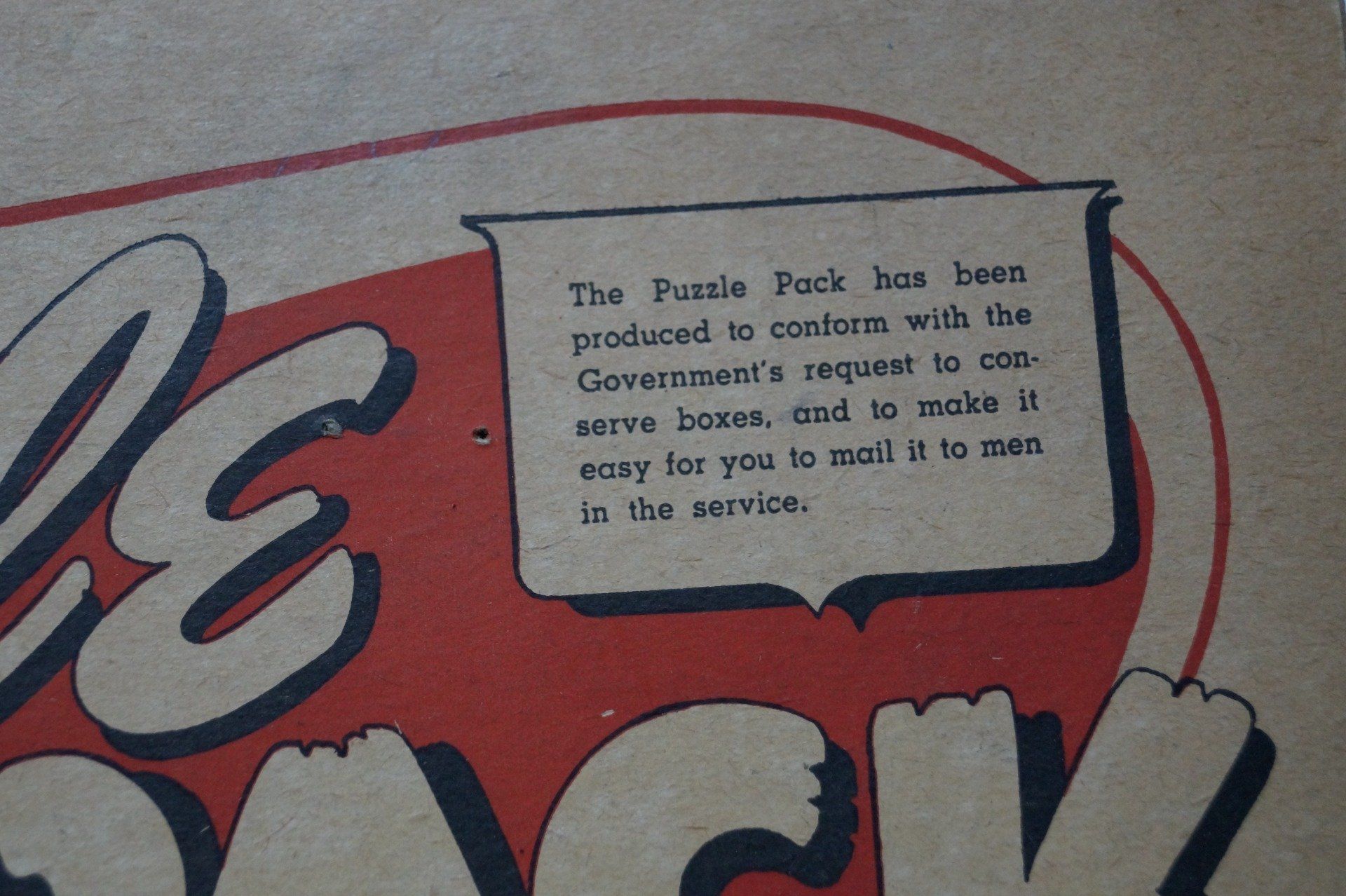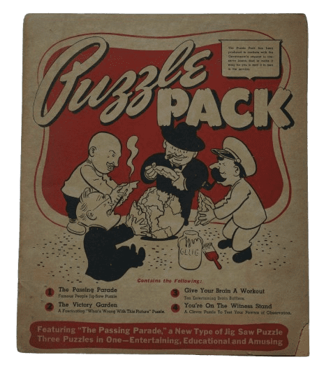Jeu Puzzle Pack, original de la seconde guerre mondiale, daté 1943. Ce kit en carton prêt à expédier au personnel militaire américain, permettait de jouer à quatre jeux différents dont un puzzle caricaturant les chefs d'états et militaires alliés et ennemis des pays en guerre. Sur la couverture sont dessinés Roosevelt, Tchang Kaï-check, Churchill et Staline. En bon état, les pages sont détachées, quelques tâches et petites déchirures. Dimensions 28,7 x 24,2 cm.