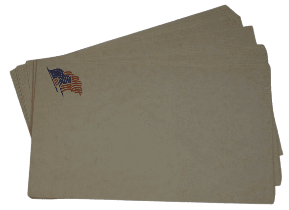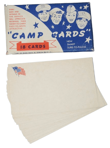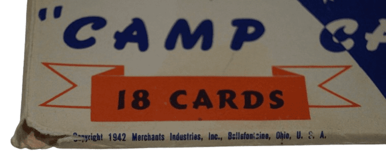 Kit de cartes postales Camp Cards original de la seconde guerre mondiale daté 1942. L'enveloppe aux couleurs patriotiques américaines contient 18 cartes vierges prêtes à être expédiées. L'enveloppe et les cartes sont datées 1942. Kit complet et en bon état, quelques usures et et déchirures aux coins de l'enveloppe. Dimensions : 14 x 8,5 cm.