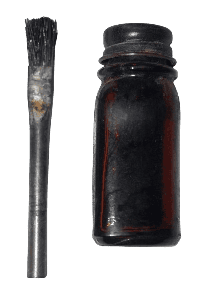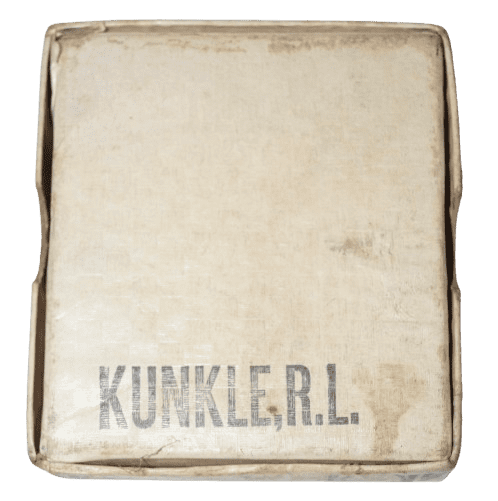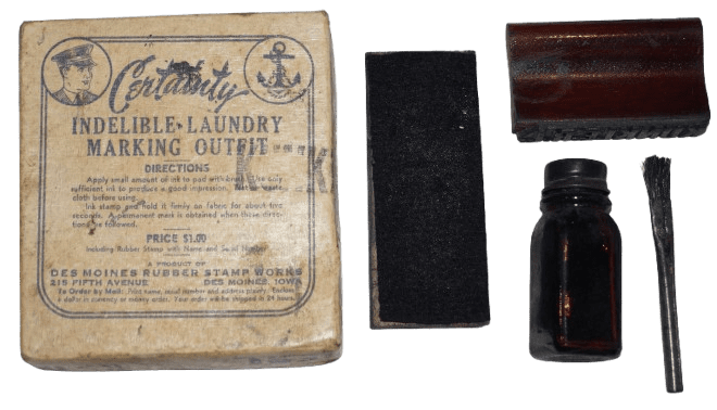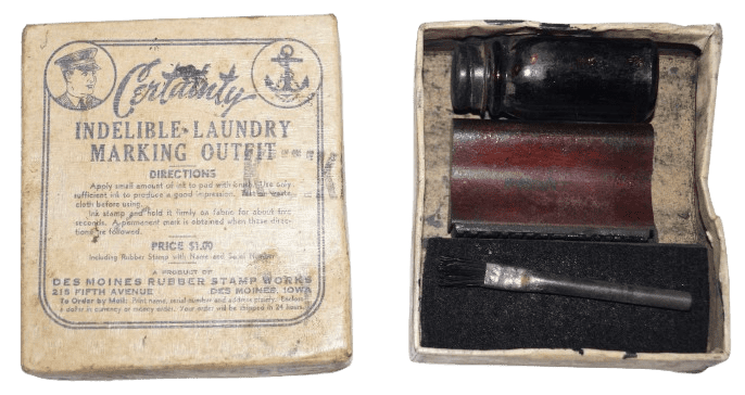 Kit de marquage Laundry Number original de la seconde guerre mondiale, utilisé pour marquer les vêtements et équipements du personnel militaire. Le kit fabriqué par Des Moines Rubber Stamp Works, est complet et a été utilisé par R.L. KUNKLE. La bouteille est vide, en état correct, la boite comporte des usures, tâches et déchirures. Dimensions de la boite 9,7 x 8,7 x 2,5 cm.