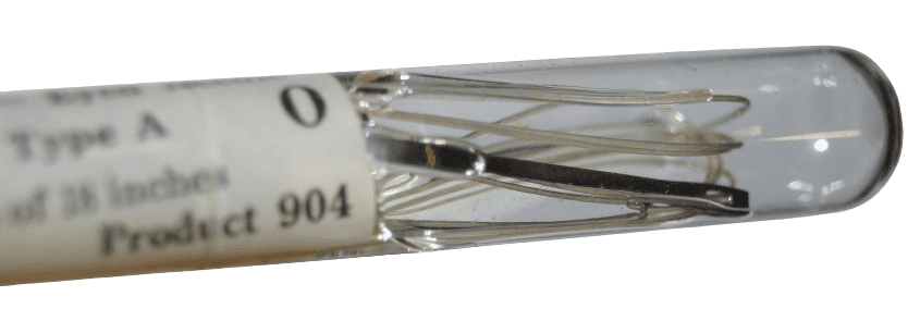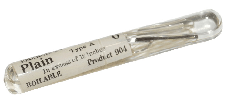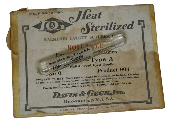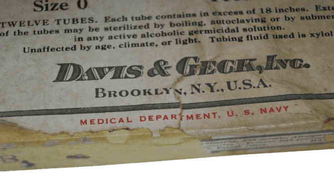 La boite carton d'origine (non incluse) marquée "Medical Department U.S. Navy" contenait 12 tubes fabriqués par Davis & Geck, Inc. Brooklyn, N.Y., U.S.A. Le numéro de patent inscrit à l'intérieur de la boite indique une fabrication à partir de la fin des années 1930. Le tube est en bon état. Dimensions 11,1 x 8,1 x 2 cm.