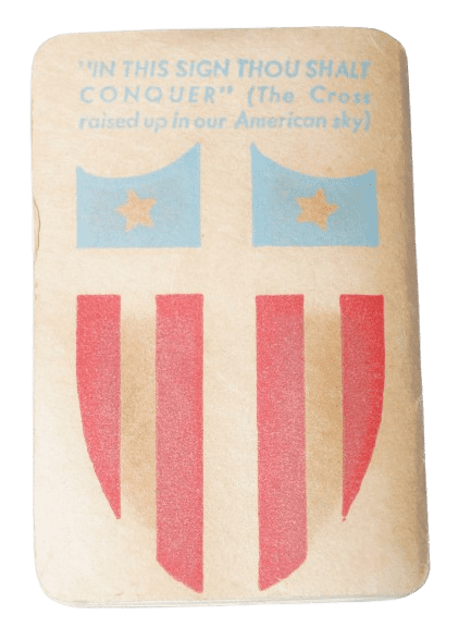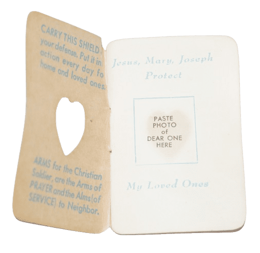 Kit religieux original de la seconde guerre mondiale daté 1943. Cet ensemble au format de poche conçu pour le personnel militaire contient un porte bible en forme de chapelet phosphorescent (brillant dans le noir, voir photo ci dessous) et un petit livret de prière de 48 pages aux couleurs patriotiques, daté 1943. Un emplacement permet de coller une photo à l'intérieur du livret. En bon état, le livret comporte quelques usures sur la couverture. Dimensions : 7,3 x 5,2 cm.