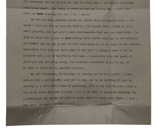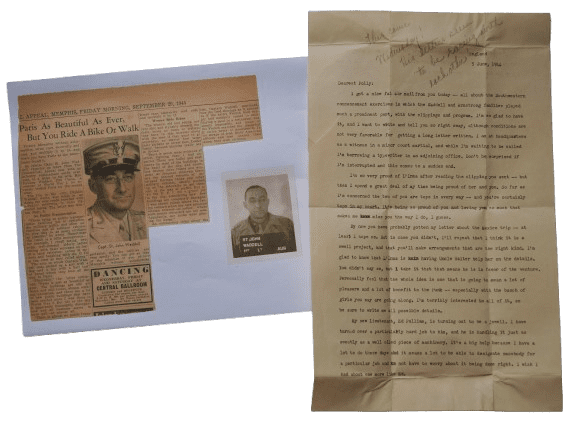 La lettre est accompagnée d'une copie d'un article de journal et une copie de sa photo quand il était 1st Lieutenant. En bon état, des usures et petites déchirures. Dimensions de la lettre : 33 x 20,3 cm.