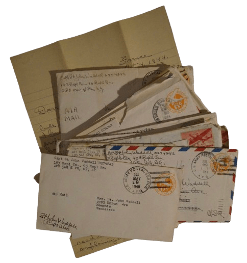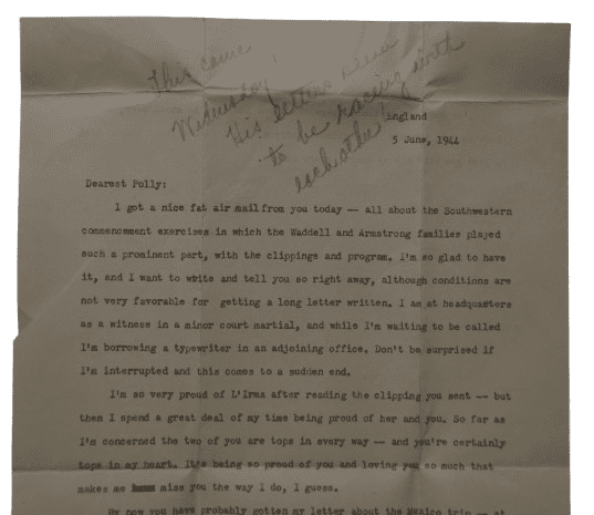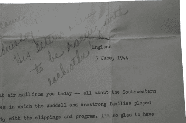 Lettre originale de la seconde guerre mondiale, écrite d'Angleterre le 5 Juin 1944, la veille du débarquement de Normandie par le Capitaine St. John Waddell, 183rd Replacement Company, 95th Replacement Battalion, la lettre est adressée à sa femme Pauline "Polly". Le Capitaine Waddell est un vétéran de la première guerre mondiale (voir dernière photo) et sera à nouveau en Europe pendant la seconde guerre mondiale. La lettre fait partie d'un ensemble de correspondance entre le Capitaine St. John Waddell et sa famille tout au long de la guerre (voir photo ci dessous, non inclus dans la vente), il sera en Europe jusqu'en 1946 (Angleterre, France, Allemgane) et sera promu Major par la suite.
