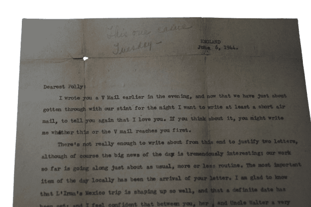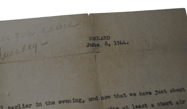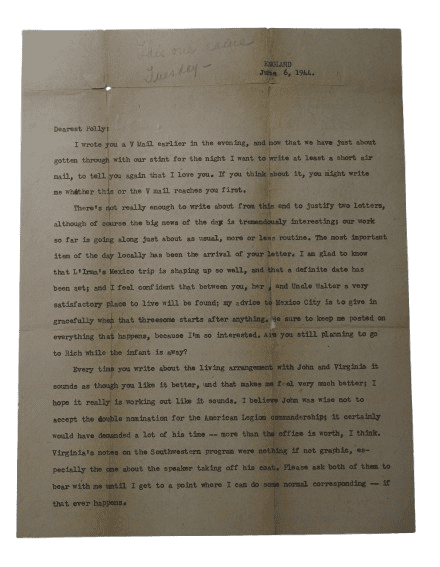 Lettre originale de la seconde guerre mondiale, écrite d'Angleterre le 6 Juin 1944, le jour du débarquement de Normandie par le Capitaine St. John Waddell, 183rd Replacement Company, 95th Replacement Battalion, la lettre est adressée à sa femme Pauline "Polly". Le Capitaine Waddell est un vétéran de la première guerre mondiale (voir dernière photo) et sera à nouveau en Europe pendant la seconde guerre mondiale. La lettre fait partie d'un ensemble de correspondance entre le Capitaine St. John Waddell et sa famille tout au long de la guerre (voir photo ci dessous, non inclus dans la vente), il sera en Europe jusqu'en 1946 (Angleterre, France, Allemagne) et sera promu Major par la suite.