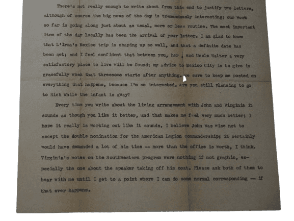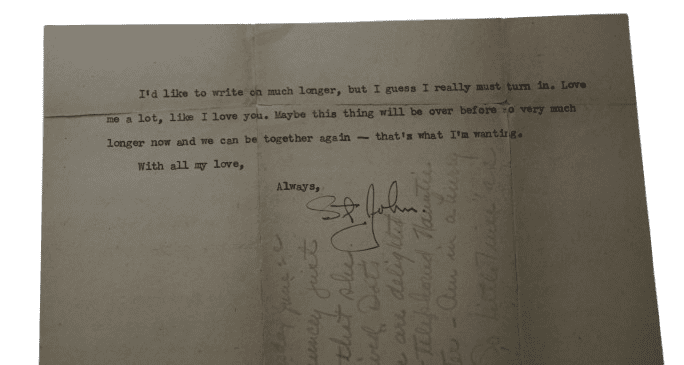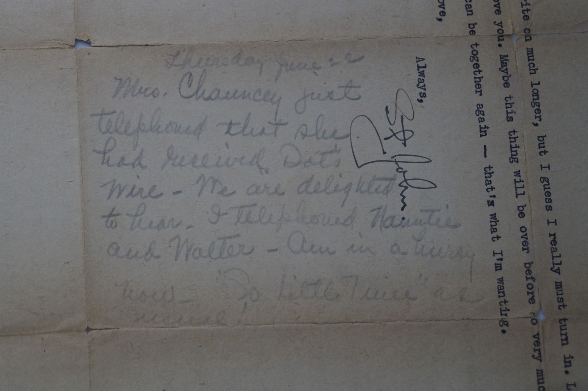 La lettre est accompagnée d'une copie d'un article de journal et une copie de sa photo quand il était 1st Lieutenant. En état correct, la lettre est fragile et comporte des usures, petites déchirures et réparations au ruban adhésif au dos. Dimensions : 26,7 x 20,3 cm.
