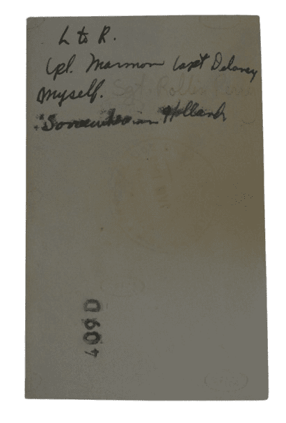 Courrier et photo originaux de la seconde guerre mondiale du SGT Rollin Perry, Medical Detachment, 459th Anti Aircraft Artillery Bn. La lettre de quatre pages a été écrite d'Allemagne le 18 Février 1945 et adressée à son oncle et sa tante, il a inclus une photo de lui et deux hommes (Cpl Marmon et Capt Delanay) prise en Hollande en Janvier 1945, le Sgt Perry et le Captain Delaney portent un brassard medical au bras. Il écrit qu'il fait parti du Medical Detachment, et qu'il était en Angleterre, à Saint Lô (Normandie), Paris, Liège en Belgique... Le 459th AAA Bn a été rattaché à la 29th Infantry Division en Normandie puis à la 9th Army.