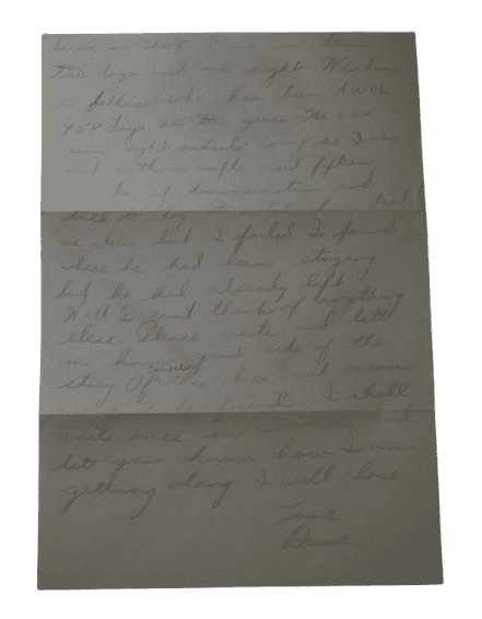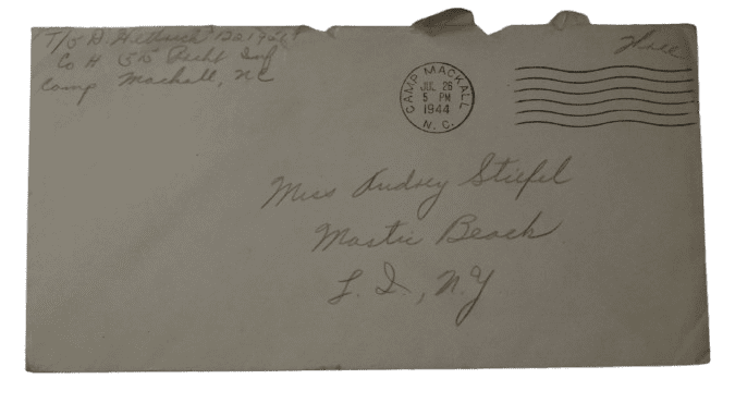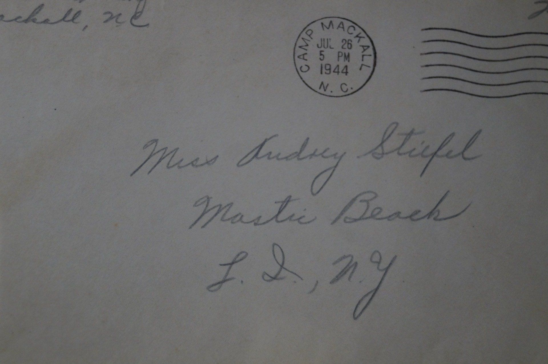 Courrier original de la seconde guerre mondiale écrit le 25 Juillet 1944 par le T/5 David H Hettrick, Co H, 515th Parachute Infantry Regiment, 13th Airborne, lorqu'il était au Camp Mackall en Caroline du Nord. La lettre d'une page recto-verso est adressée à sa petite amie.