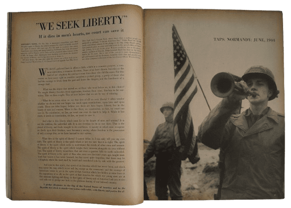 Magazine Life original de la seconde guerre mondiale, édition du 3 Juillet 1944 de 88 pages. En couverture deux soldats américains en Italie, à l'intérieur un article de neuf pages sur la bataille de Normandie avec photos de Carentan, Isigny, St Sauveur, Bayeux, Cherbourg... Divers articles et belles publicités. En bon état, des usures et quelques tâches sur les bords. Dimensions 35,7 x 26,8 cm.