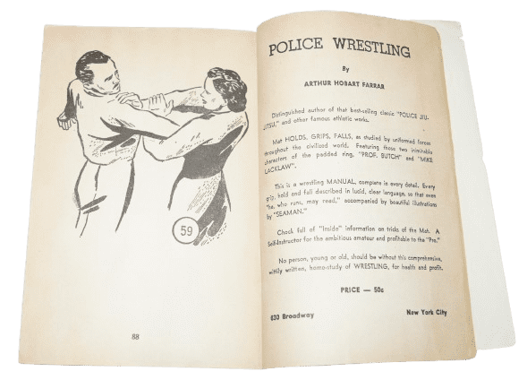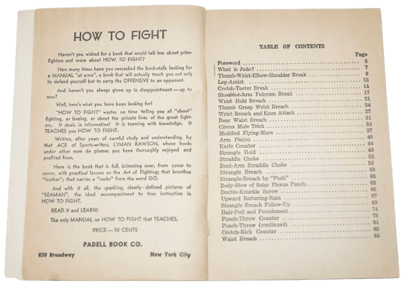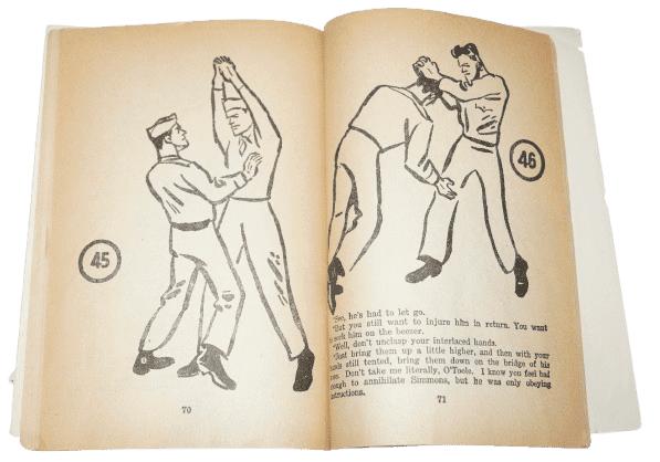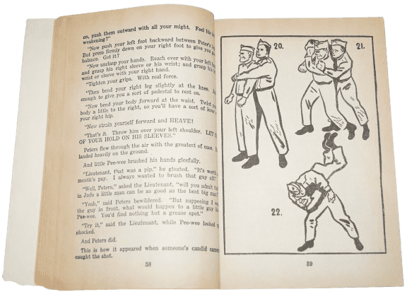 Manuel American Judo original de la seconde guerre mondiale. Ce livret de 90 pages aux couleurs patriotiques américaines a spécialement été édité pour le personnel militaire américain hommes et femmes, pour l'apprentissage des techniques de combat du judo et jiu-jitsu. Le livet comporte des illustrations et textes. La couveture comporte des déchirures, ainsi que quelques pages en haut à la fin du livret. Dimensions 19 x 13,4 cm.