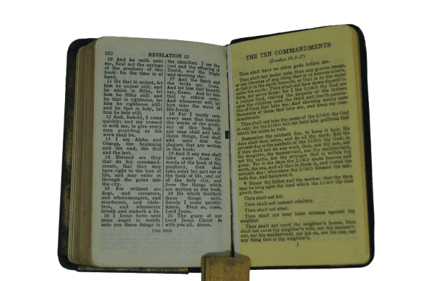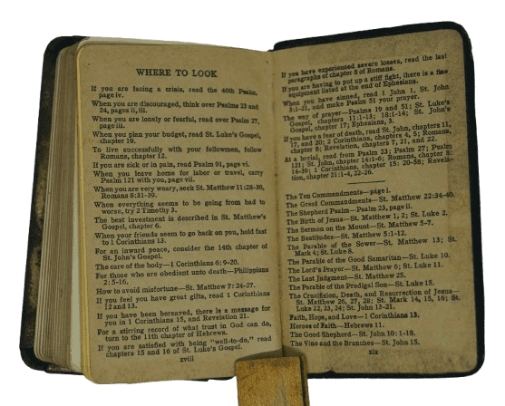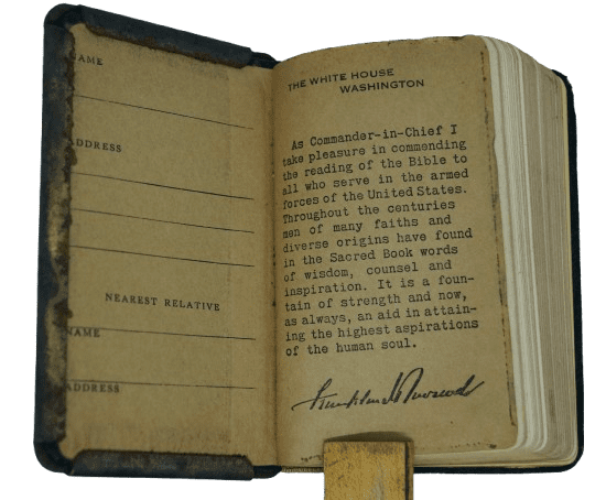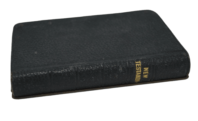 Nouveau testament avec protection pare-éclats original de la seconde guerre mondiale. Bible de 530 pages éditée pour le personnel militaire et paraphée par le président Franklin D Roosevelt. La couverture gravée "To my loved one" comporte une protection en métal épais à l'avant qui pouvait protéger des éclats de projectile si celle ci était placée dans une poche au niveau du cœur. En bon état, le couverture métal comporte des traces de corrosion, la bible quelques usures. Dimensions 11,7 x 7,4 x 1,9cm.