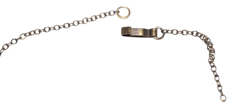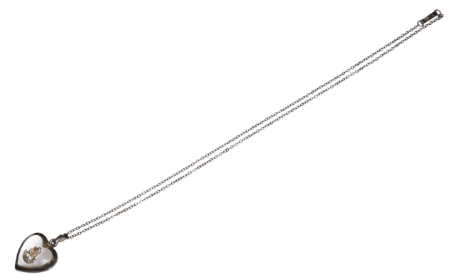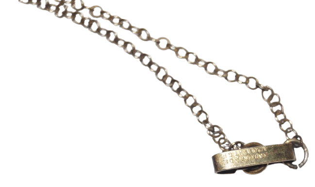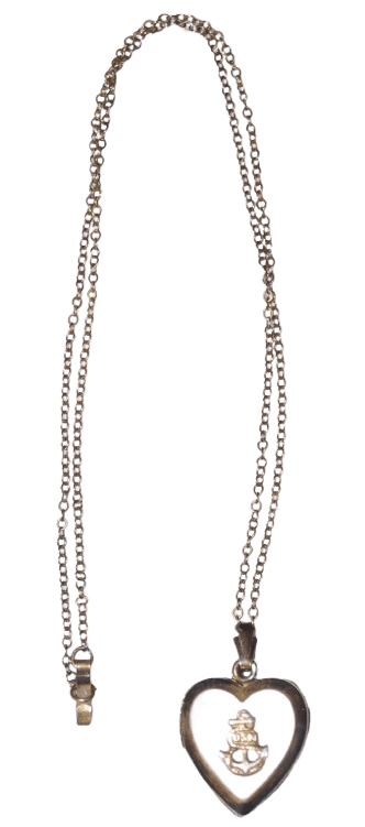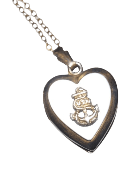 Pendentif porte photos USN original de la seconde guerre mondiale, vendu au personnel féminin et aux personnel de l'US Navy pour offrir. Le pendentif en nacre et argent plaqué or s'ouvre en deux ou un double compartiment contient la photo d'une homme. La chaine et le pendentif sont en argent plaqué or, le pendentif est marqué /20 STERLING, le fermoir de la chaine marqué AUTOMADE (fabriquant de bijoux depuis 1922) 1/20 12K G.F. En bon état, des usures, le plaquage en or s'est un peu estompé. Longueur totale 27,6 cm.