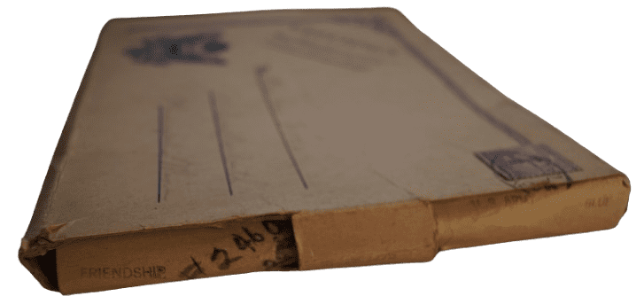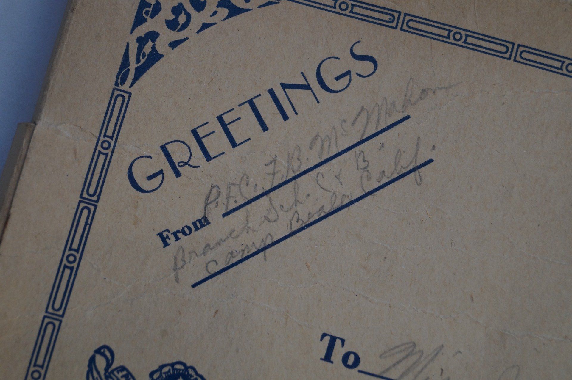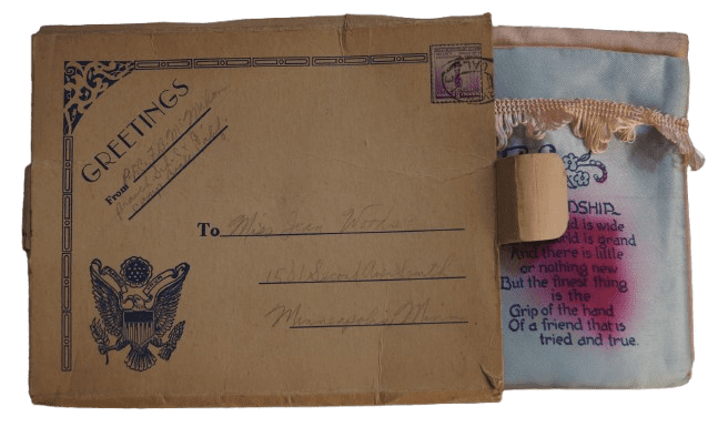Pochette à mouchoir US ARMY originale de la seconde guerre mondiale envoyée du Camp Beale en Californie par le PFC F.B. Mc Mahon à son amie Jean Woods de Minneapolis, Minesotta. La boite carton contient une pochette à mouchoir US ARMY modèle "Friendship" vendue au personnel militaire américain pour offrir. La pochette en tissus satiné est en bon état, la boite comporte des usures et déchirures. Dimensions de la boite 20,3 x 16,3 x 2 cm.