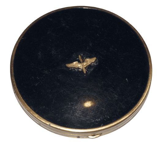 Poudrier US Army Air Forces original de la seconde guerre mondiale, vendu dans les PX au personnel féminin ou aux soldats pour offrir. Le poudrier en métal doré, le couvercle est peint en noir, complet avec sa houppette, petit reste de poudre de riz. En bon état, des usures autour de l'insigne et rayures. Diamètre : 8 cm.