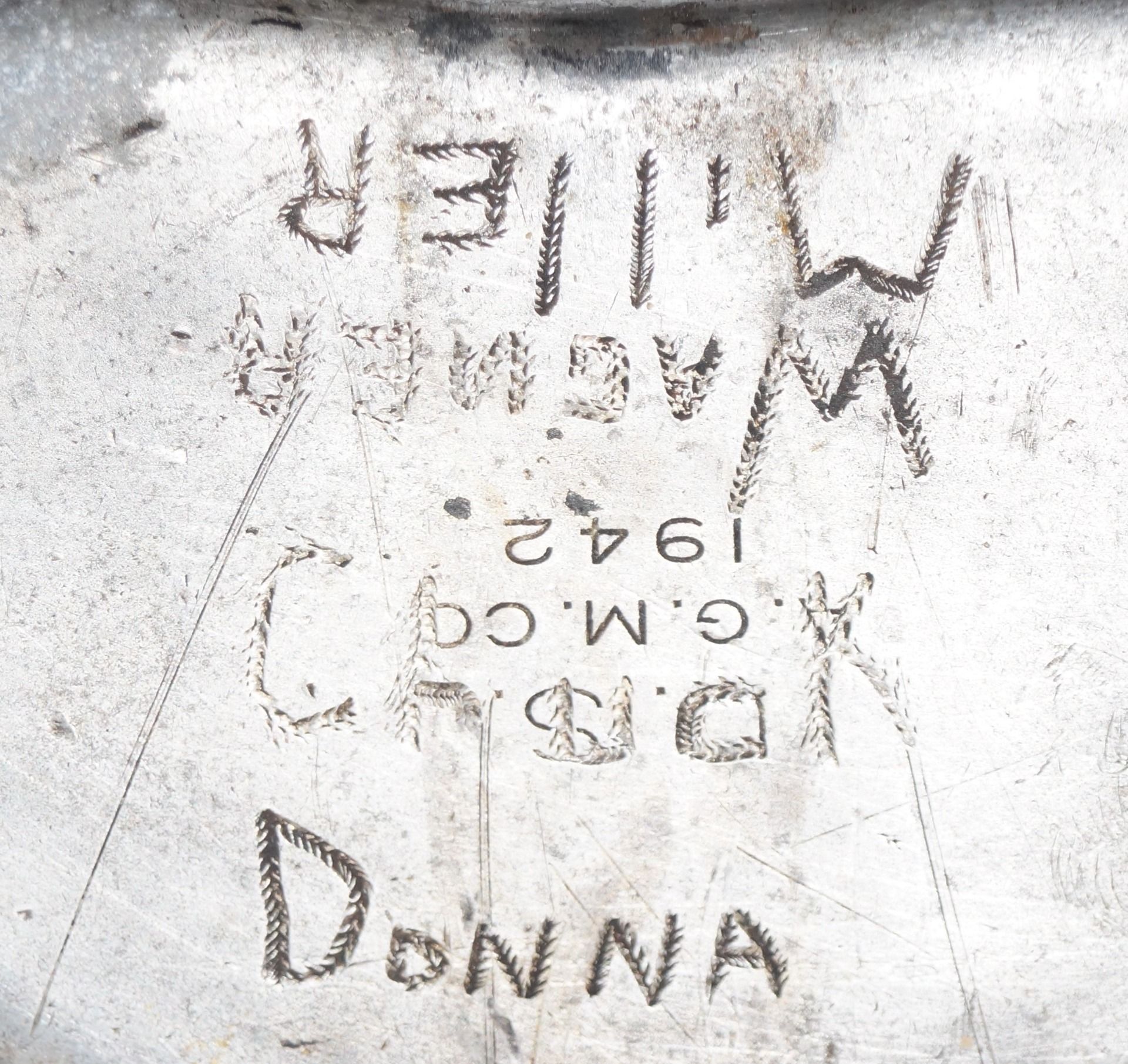 Quart de Gourde US original de la seconde guerre mondiale retrouvé secteur Lure en Haute Saône il y a plusieurs années parmi d'autres équipements américains laissés sur place. Le quart en aluminium est estampé du laundry number W 2350 et gravé de plusieurs noms en dessous WAGNER MILLER - CHUCK - DONNA. Marquages / U.S. A.G.M. CO 1942. La ville de Lure a été libérée le 16 Septembre 1944 par la 3rd Infantry Division.