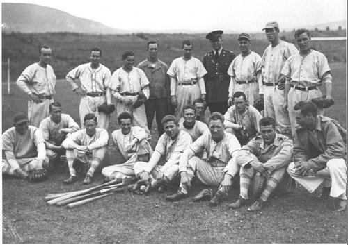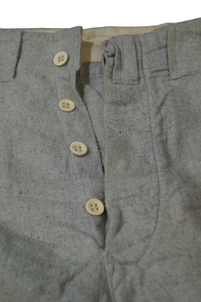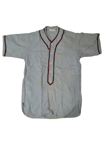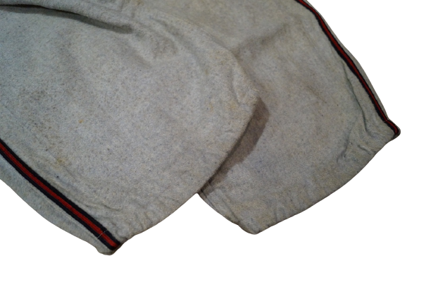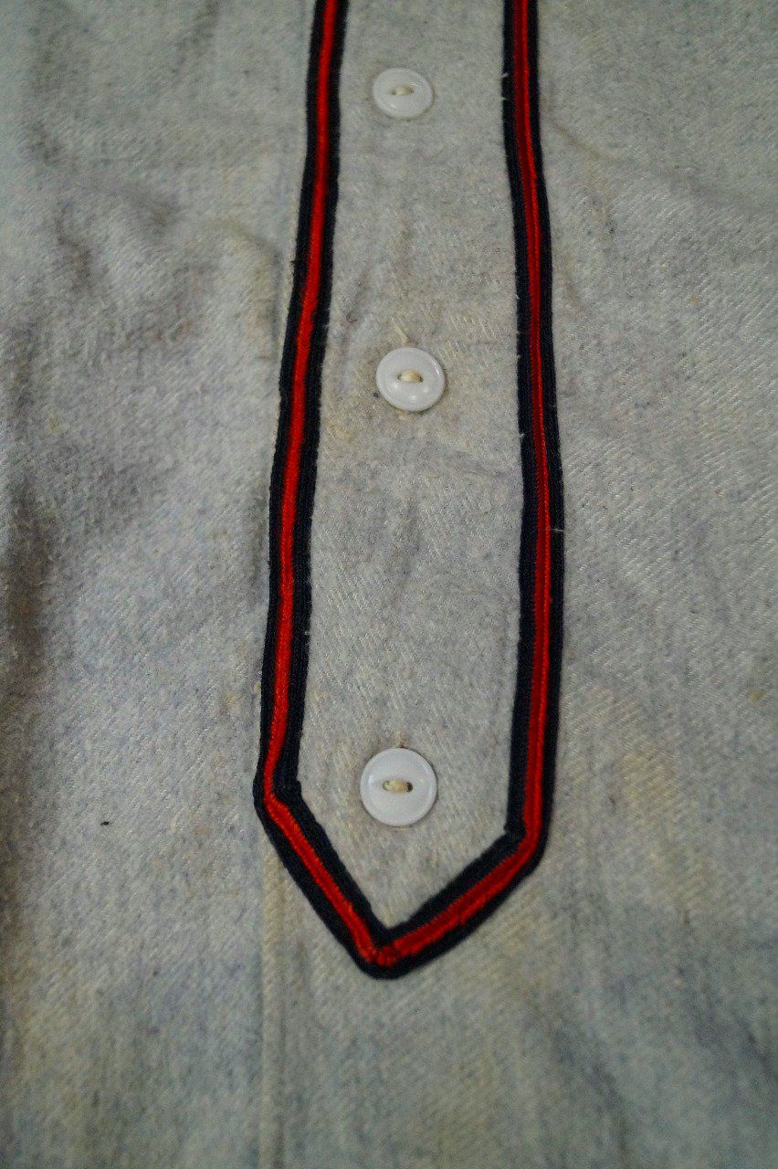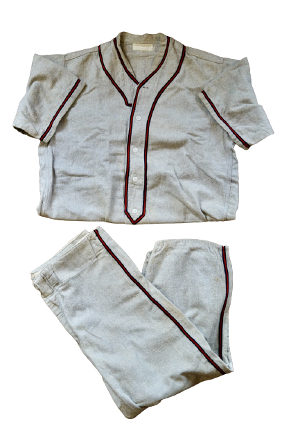 Tenue de baseball t-shirt et pantalon, originale des années 1940. La tenue a été fabriquée en flanelle de laine, matière largement utilisée pour la fabrication des vêtements et uniformes pendant la seconde guerre mondiale. Le baseball était un sport très pratiqué par le personnel militaire américain. Liseret rouge et noir sur la veste et le pantalon. L'etiquette est effacée mais la taille correspond à un L, dimensions du t-shirt : longueur 87 cm, largeur d'épaule à épaule 45 cm, pantalon : longueur 86 cm, taille 44 cm. En bon état, quelques usures, petites déchirures et tâches.