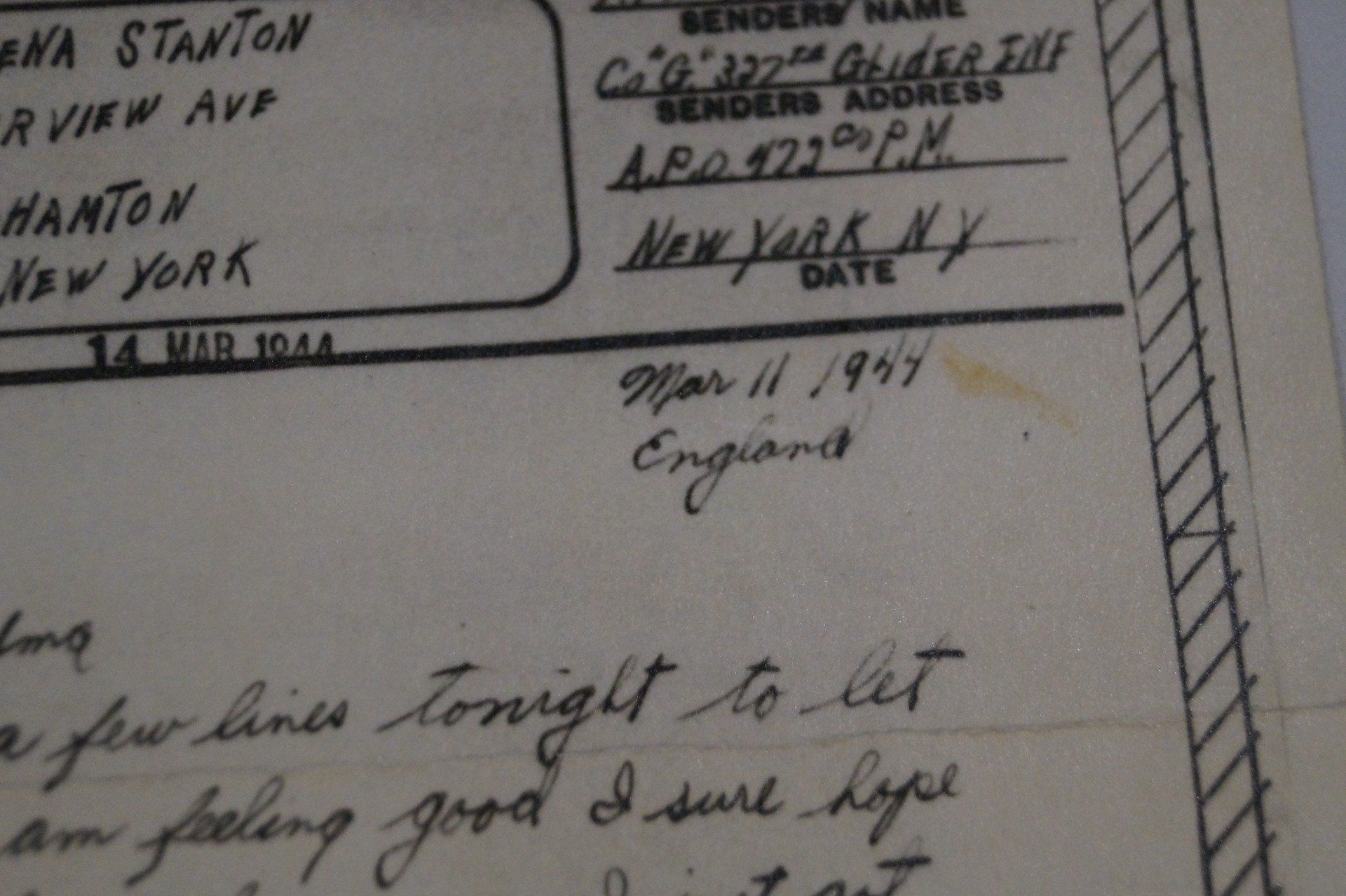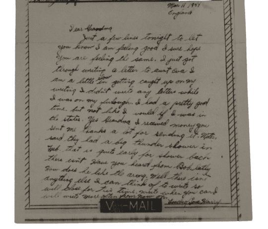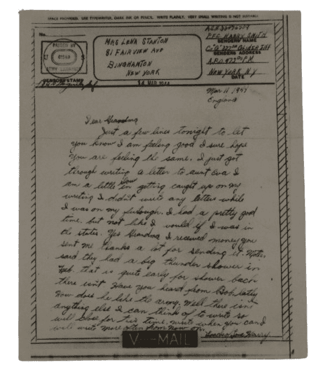 V-mail original de la seconde guerre mondiale, envoyé d'Angleterre le 11 Mars 1944 par le Pfc Harry M Smith, 101st Airborne Division, 327th Glider Infantry Regiment, Co G et adressé à sa grand mère Lena résidant à Binghamton New York.